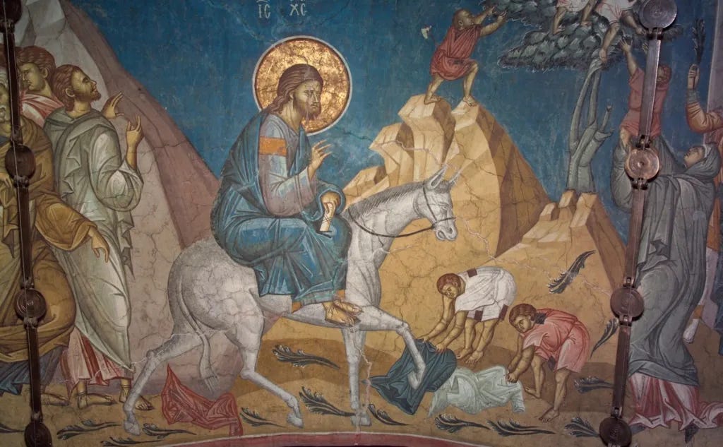In the Gospel of John, there is no further repetition of the words “come and see.” But I think that the Church Herself calls these words out to us all once again on today’s feast of the Entry of the Lord into Jerusalem, on the eve of Holy Week. Come and see: Christ enters triumphant into the Holy City, the King of Israel, the Conqueror of Death, the Son of the Living God. Yet the King of Glory is arrayed not in the royal purple, but in the vesture of poverty; He arrives not in pomp and glory, but riding on a lowly donkey borrowed from a local villager. And though the gathered throngs shout “Hosanna” and hail Him as their king, nevertheless He knows all too well that in a few short days, those same crowds will cry out bitterly renouncing Him and demanding His crucifixion.